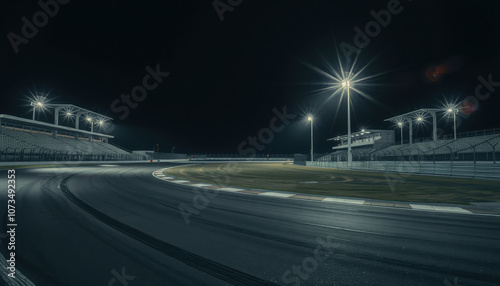nighttime view of race circuit featuring illuminated track and grandstands, showcasing excitement of motorsport. empty track invites anticipation for future races