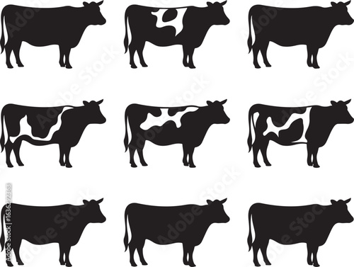 Nine Cow Silhouettes With Black and White Spots Against White Background cattle livestock