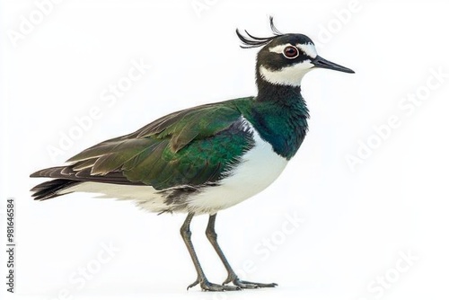 northern lapwing stands elegantly on the ground, displaying its striking green and black feathers, perfect for breeding season. The bird exudes natural beauty in isolation.