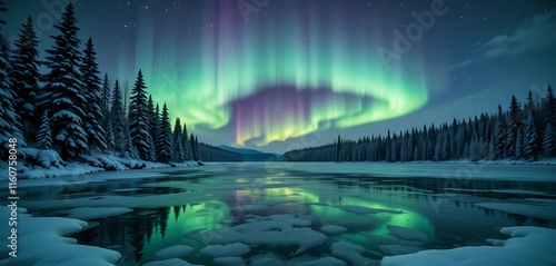 Northern Lights Over a Frozen Lake "A frozen lake under the shimmering green and purple hues of the northern lights. Snow-covered pines surround the lake, their reflections faintly visible on the ice.