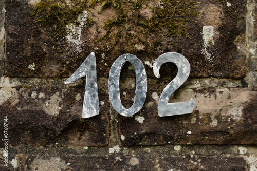 102, architecture, brick, building, closeup, door, doorway, front, mathematic, metal, number, object, residential, signs, single, symbol, textured