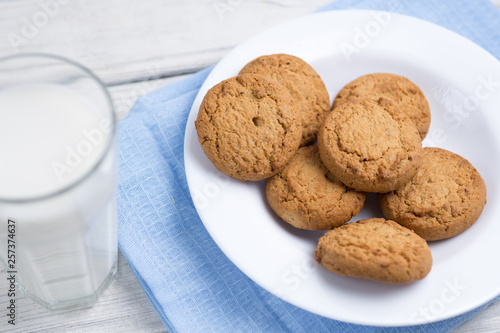 milk, cookie, oatmeal, dessert, breakfast, healthy, wooden, white, selective focus, diet, sweet, closeup, table, biscuit, pastry, meal, homemade, food, drink, glasses, delicious, baking, snack, dairy, dairy product, bunting