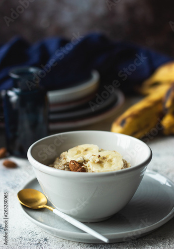 oatmeal, porridge, banana, bowl, breakfast, healthy, background, food, diet, white, closeup, fresh, rustic, fruit, organic, sweet, morning, oat, grain, cereal, natural, vintage, health, dessert, traditional, delicious, tasty, nourishment, muesli, spoon, epicure, vegetarian, dairy, table, nut, walnut, summer, old, vegan, juice, nut, nobody, meal, plate, fitness, almond