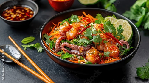 Octopus food: Asian cuisine salad. Vibrant seafood salad with fresh herbs and lime wedges.