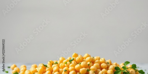 of creamy yellow chickpeas is set against a soft gray background with a sprinkle of chopped fresh parsley scattered around the edges, herbed, everyday food