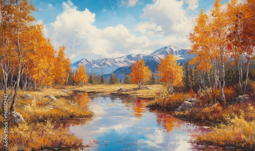 Oil painting depicting a beautiful autumn landscape in a national park showcasing vibrant fall colors and serene natural elements