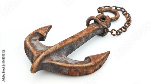 Old rusty ship anchor with a thick metal chain, isolated on white background
