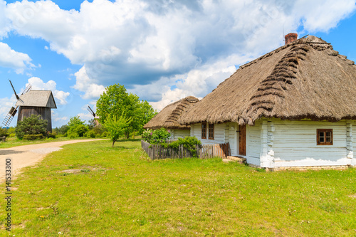 Old traditional houses with straw roof in Tokarnia village on sunny spring day, Poland