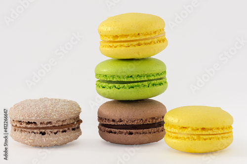 on a light background close-up of colored cookies. Macaron. pastries are laid out in a stack. Yellow, green, brown. Deliciously delicious. Horizontally photo.