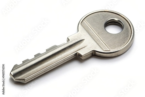One key isolated on a white background with a clipping path tilted at an angle, object, symbol, cutout, lock, shiny, clipping path,key, concept, solution, tilted, metal, isolated