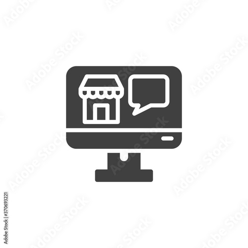 Online shopping support vector icon. filled flat sign for mobile concept and web design. Pc screen with shop and speech bubble glyph icon. Symbol, logo illustration. Vector graphics