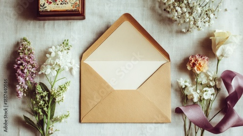 Open kraft paper envelope rests centrally surrounded by assorted fresh flowers and a satin ribbon