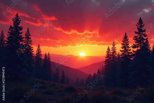Orange and red hues bleed into the sky as pine forest burns, sunset blaze, landscape