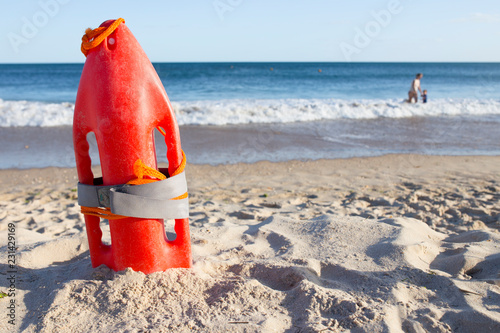 Orange rescue buoy planted on sand beach. Mother with little boy at the bottom