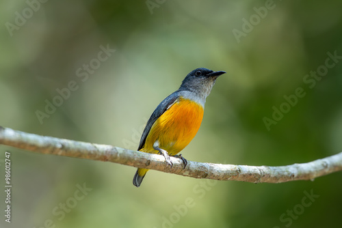 bird, wildlife, nature, avian, fauna, small bird, songbird, passerine, perched, tree branch, twig, tree, leaf, foliage, green background, bokeh, blurred background, outdoors, wild, animal, closeup, portrait, half face, looking, tropical bird, southeast asia, asia, malaysia, biodiversity