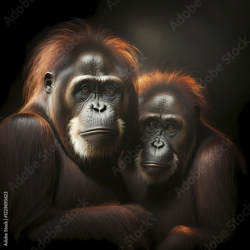 Orangutans (Pongo) primate genus of the great ape (Hominidae) family, black background, AI generated
