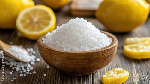Organic coarse sea salt in wooden bowls paired with fresh lemons, showcasing an authentic and healthy food concept, perfect for enhancing various culinary endeavors.