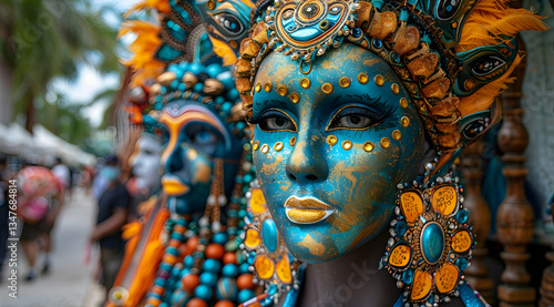 mask, woman, blue, gold, colourful, jewellery, festival, display, craft, art, face, portrait, turquoise, orange, bead, hand-made, market, tropical, carnival, holiday, culture, ethnic, traditional, exhibition, tour tourism, summer, detail, closeup, bright, vibrant, beauty, fashion, headwear, accessory, decorative, model, eye-catching, exhibit, street fair