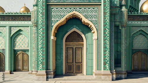 mosque, entrance, door, green, tile, islamic, architecture, ornate, gold, detail, pattern, design, arabic, calligraphy, decoration, intricate, beautiful, majestic, grand, religious, culture, heritage, history, faith, spirituality, islam, muslim, building, facades, structure, traditional, craftsmanship, artistry, aesthetic, elegance, style, art, window, column, arch, dome