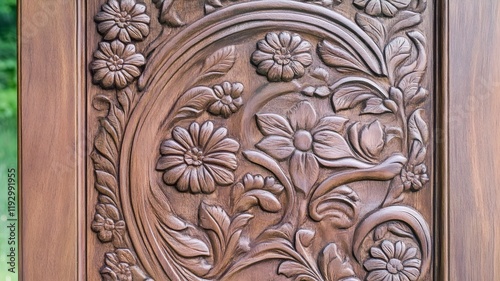 carved, wood, door, panel, ornate, floral, paisley, motif, traditional, indian, polished, satin, sheen, architectural, elegance, detail, pattern, texture, design, decor, home, interior, exterior, nature, botany, flora, plant, foliage, organic, craftsmanship