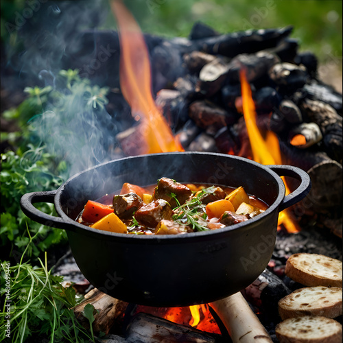 Outdoor fire-cooked stew in a cast iron pot hanging over an open flame with fresh herbs and smoky atmosphere