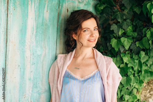 Outdoor portrait of beautiful young woman with dark hair, posing on green background