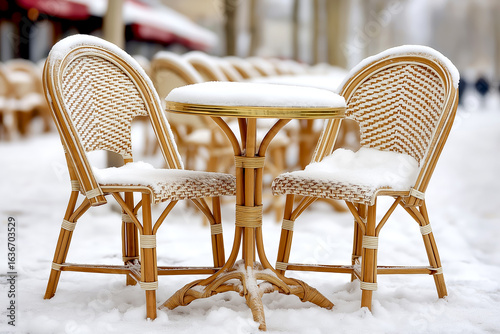 snow, cafes, chair, table, winter, cold, wicker, street, frost, season, ice, glacé, seating, landscape, urban, empty, travel, white, decor, leisure, destination, holiday, cosy, scenic, background, peaceful, tour tourism, europa, atmosphere, lifestyle, architecture, dining, hospitality, romantic, chair, furniture, eatery, outdoors, terrace, rattan