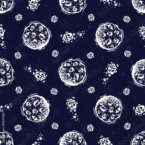 Outer Space Seamless pattern. Meteor Shower. Hand Drawn Doodle Meteorites, Asteroids. Cosmos Background. Galaxy. Vector Universe