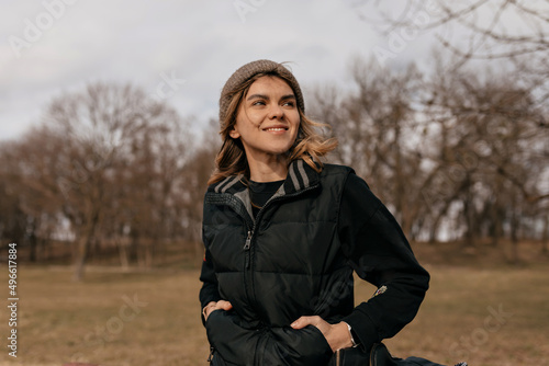 Outside close up portrait of charming smiling woman is looking away while traveling in the midst of nature in sunny warm spring day