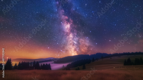 Over a quiet meadow and a dense forest, on a quiet evening, there is a spectacle of a sky full of stars. The Milky Way runs wide across the sky, exuding radiance and mystery, filling space.