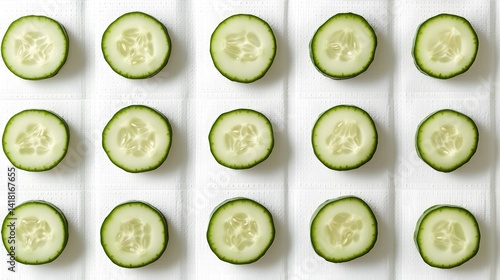 Overhead shot of fifteen cucumber slices arranged neatly on white paper. A clean, simple, and refreshing image, perfect for summer themes or healthy eating concepts.
