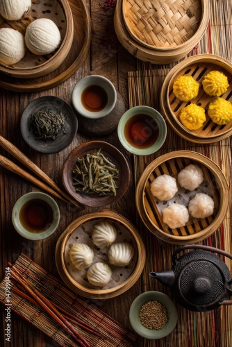 Overhead Still Life of Assorted Dim Sum in Bamboo Steamers with Tea and Chopsticks on Rustic Wooden Table