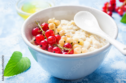 Overnight oatmeal porridge with berries on light blue background. Healthy breakfast. Selective focus, space for text.