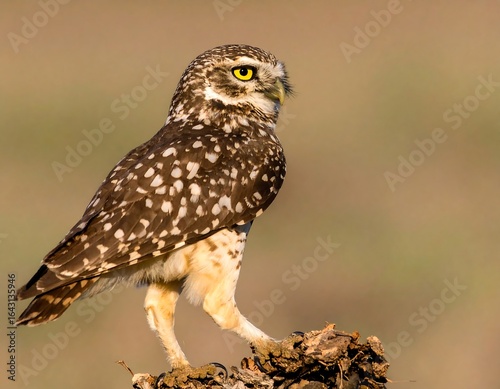 owl, bird, wildlife, perched, stump, brown, spotted, yellow, eye, nature, bird of prey, nocturnal, feathered, predator, vertebrate, animal, sharpened, detail, sharp, natural, tawny, cream, light, dark, pattern, texture, side, profile, standing, grounded, vertical, closeup, photo, desert, field, background, beige, tan, sunlight, horizon, observer
