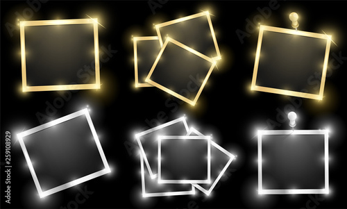 Pack of square realistic gold and silver shining frame templates with shadows isolated on black background. Vector illustration
