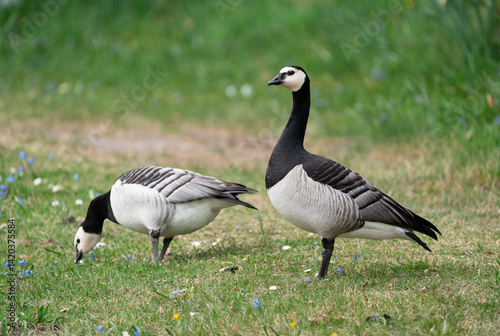 Pair of barnacle geese (Branta leucopsis) foraging in a meadow full of flowers on a spring day in Sweden
