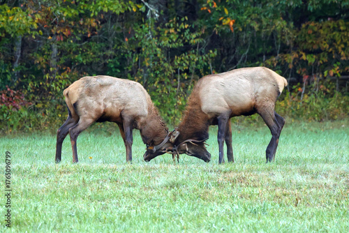 Pair of bull elk locking antlers in show of herd competition and dominance.