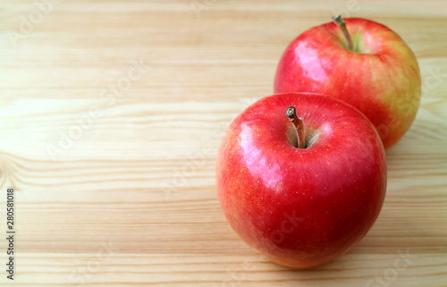 Pair of fresh ripe red apples isolated on natural wooden table with copy space
