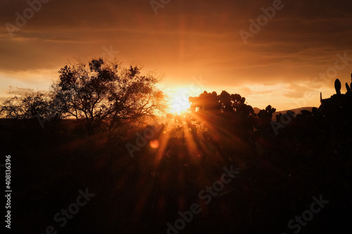 Paisaje al atardecer naranja con negro y destellos de luz del sol