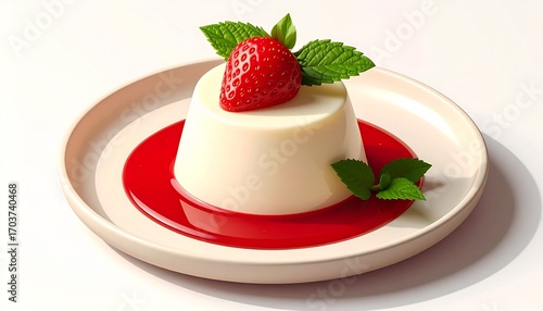 Panna cotta dessert with strawberries and mint on a plate