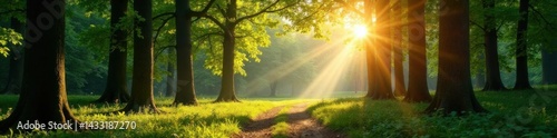 Panorama of a wald with sunlight filtering through trees, sunbeams, wales