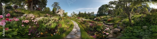 Panoramic 360 degrees garden pathway nature scene hdr landscape serene environment