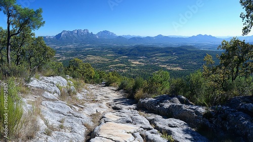 Panoramic landscape view from rocky terrain. Valley, trees, and distant mountains under a clear blue sky