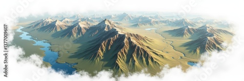 mountain, landscape, aerial, peak, range, river, vale, cloud, highland, sky, scenic, altitude, panorama, terrain, geology, wilderness, topography, elevation, majestic, distance, ridge, nature, environment, viewpoint, calmness, expanse, highland, horizon, scenery, cloudscape, overlook, perspective, untouched, elevated, vista, unpolluted