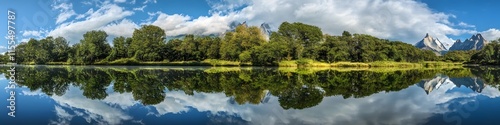 Panoramic view of the serene Laguna Amarga surrounded by lush summer greenery. with Torres del Paine reflected perfectly in the calm waters. in 4K resolution