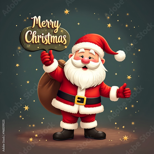 Papá Noel sujetando en alto un letrero con el texto feliz navidad