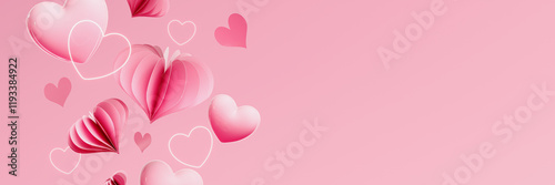 Paper hearts banner with copy space. Valentine's day concept on pink background 3D Rendering, 3D Illustration