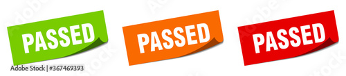 passed, pass, sticker, label, peeler, signs, tags, badge, banner, design, element, emblem, flier, insignia, isolated, note, notice, page, paper, peel, price tag, rectangular, set, square, template, vector, vignette, white background, green, orange, red
