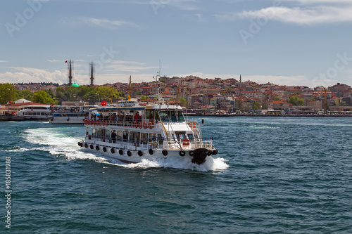Passenger ferry ship on the Gulf Golden Horn, Sea front landscape of Istanbul historical part, Turkey famous city.