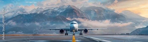 Passenger jet on a runway with breathtaking mountains in the distance, combining the excitement of aviation with aweinspiring nature